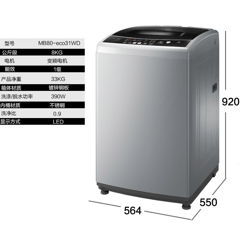 商品名称:Midea/美的 MB80-eco31WD 8公斤变频洗衣机全自动波轮智能大容量 省电静音 0.9洗净比 洗得更干净